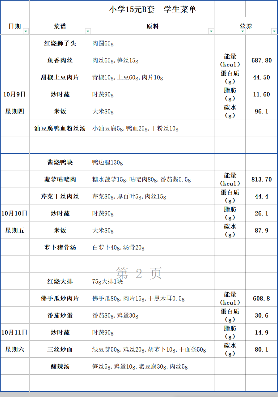 2025学年第一学期第6周学生午餐B餐
